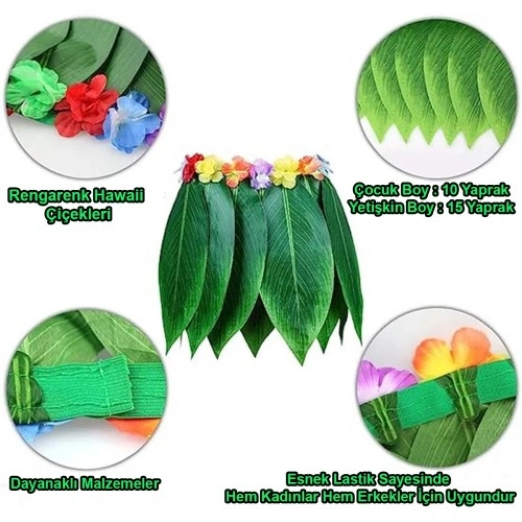 Tropikal Esintili Hawaii Yapraklı Parti Eteği | Yetişkin BoyAdaların egzotik ruhunu üzerinizde taşıyın! Hawaii Yapraklı Parti Eteği, alışılmış püsküllü modellerin ötesine geçerek, gerçekçi yaprak tasarımıyla size tam bir "orman yerlisi" veya "tropikal dansçı" görünümü kazandırır. Doğal yeşil tonları ve dolgun yapısıyla plaj partilerinden kostüm balolarına kadar her etkinlikte doğanın enerjisini yansıtın.Öne Çıkan ÖzelliklerGerçekçi Yaprak Tasarımı: Etek üzerinde yer alan 15 adet yapay yaprak, el işçiliği hissi veren detaylarıyla son derece doğal ve otantik bir duruş sergiler.Dolgun ve Hareketli: 35 cm yaprak yüksekliği, dans ederken veya yürürken eteğin ritmik bir şekilde hareket etmesini sağlayarak görsel bir şölen sunar.Konforlu Lastikli Bel: Esnek bel yapısı sayesinde farklı beden ölçülerine (S-XL) kolayca uyum sağlar; gün boyu süren eğlencelerde sıkma yapmaz.Kaliteli Malzeme: Dayanıklı yapay yapraklardan üretilmiştir; rengini korur ve defalarca kullanılabilir.Kullanım AlanlarıHawaii & Aloha Temalı Partiler: Doğum günleri ve bahçe partilerinde konsepti en üst seviyeye taşıyan ana parça olarak.Yaz ve Plaj Organizasyonları: Beach party, havuz başı kutlamaları ve "Tiki Bar" etkinlikleri için mükemmel seçim.Dans Gösterileri ve Müsameler: Hula dansı veya tropikal temalı sahne performanslarında profesyonel bir kostüm detayı.Bekarlığa Veda & After Party: Eğlenceli fotoğraf çekimleri ve konsept kutlamalar için fark yaratan bir aksesuar.Neden Bu Eteği Seçmelisiniz?Sıra Dışı Görünüm: Klasik ipli Hawaii eteklerinden sıkılanlar için çok daha iddialı ve "vahşi" bir alternatif sunar.Kolay Kombinlenir: Sadece bir büstiyer veya çiçekli kolye ile saniyeler içinde tam bir kostüme dönüşür.Pratik Kullanım: Lastikli yapısı sayesinde kıyafetlerin üzerine bile hızlıca giyilip çıkarılabilir.Teknik Özellikler TablosuÖzellikDetayModelHawaii Yapraklı EtekBedenYetişkin (Esnek Lastikli Bel)Yaprak Sayısı15 Adet Dolgun YaprakYaprak Yüksekliği35 cmRenkDoğal Tropikal YeşilPaket İçeriği1 Adet Yaprak Eteği