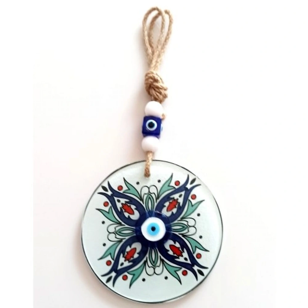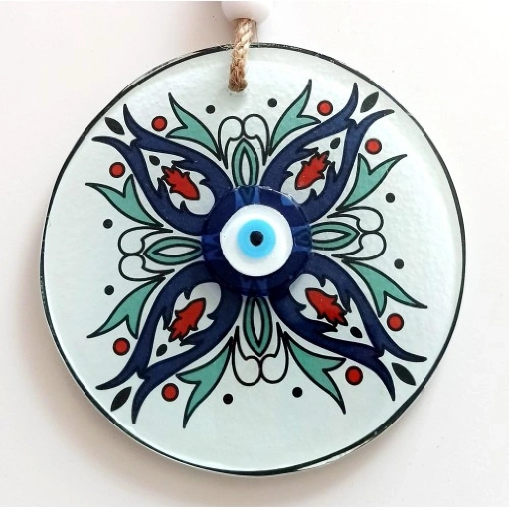 Çiçek desenli nazar boncuklu duvar süsümüz füzyon cam malzeme kullanılarak üretilmektedir. Ürünümüz 12 santimetre çapındadır. İp dahil ürünümüz yaklaşık 26 santimetre boyundadır.