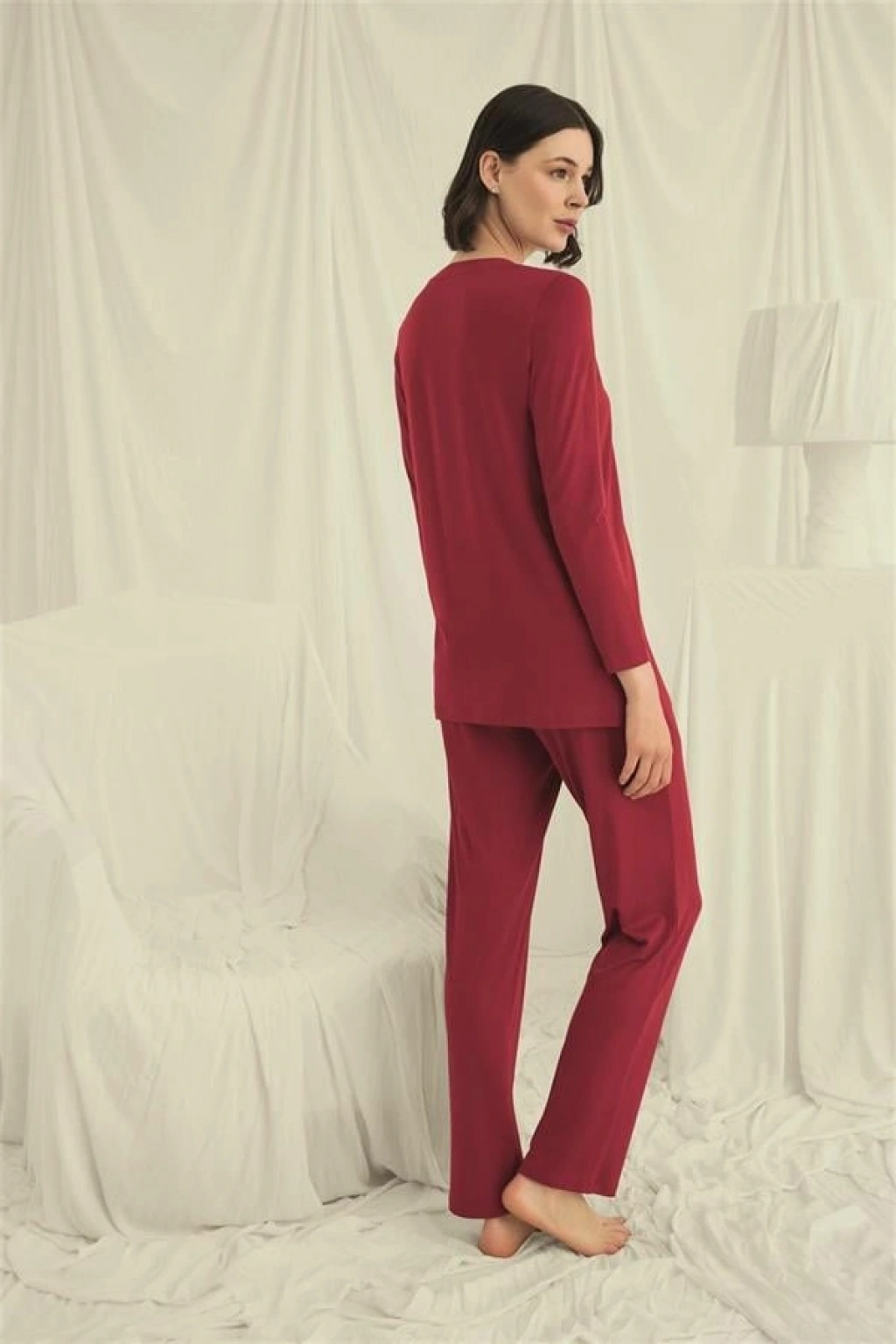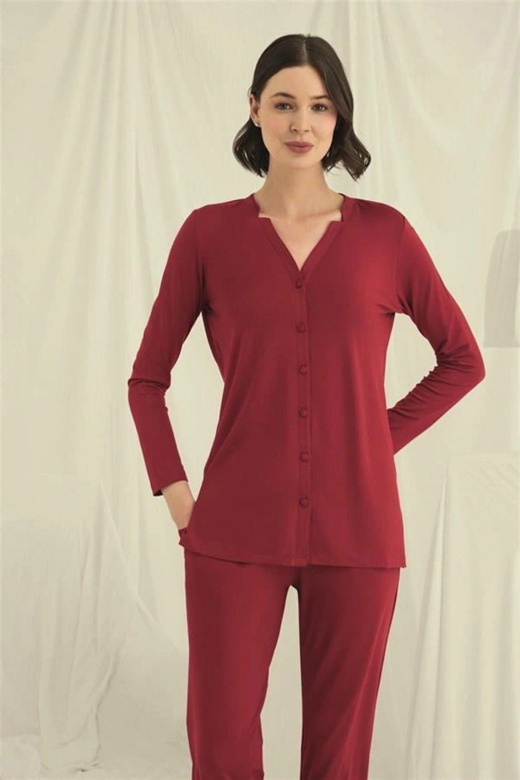 Üst: Kırmızı renklidir, V yakalıdır, önü boydan düğmelidir, uzun kolludur, örme kumaştır.