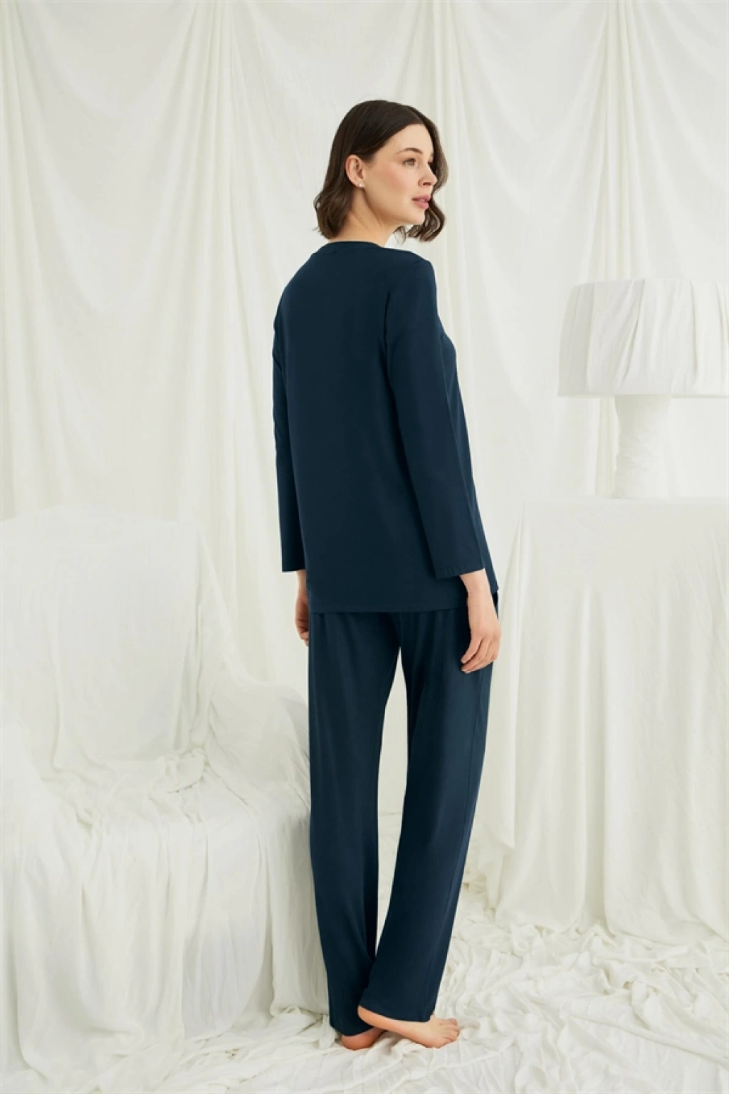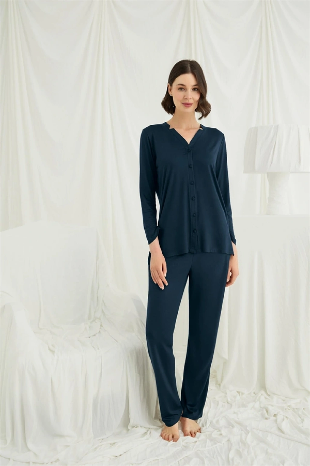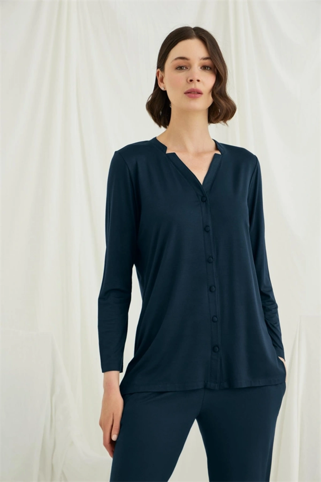Üst: Gece mavisi renklidir, V yakalıdır, önü boydan düğmelidir, uzun kolludur, örme kumaştır.