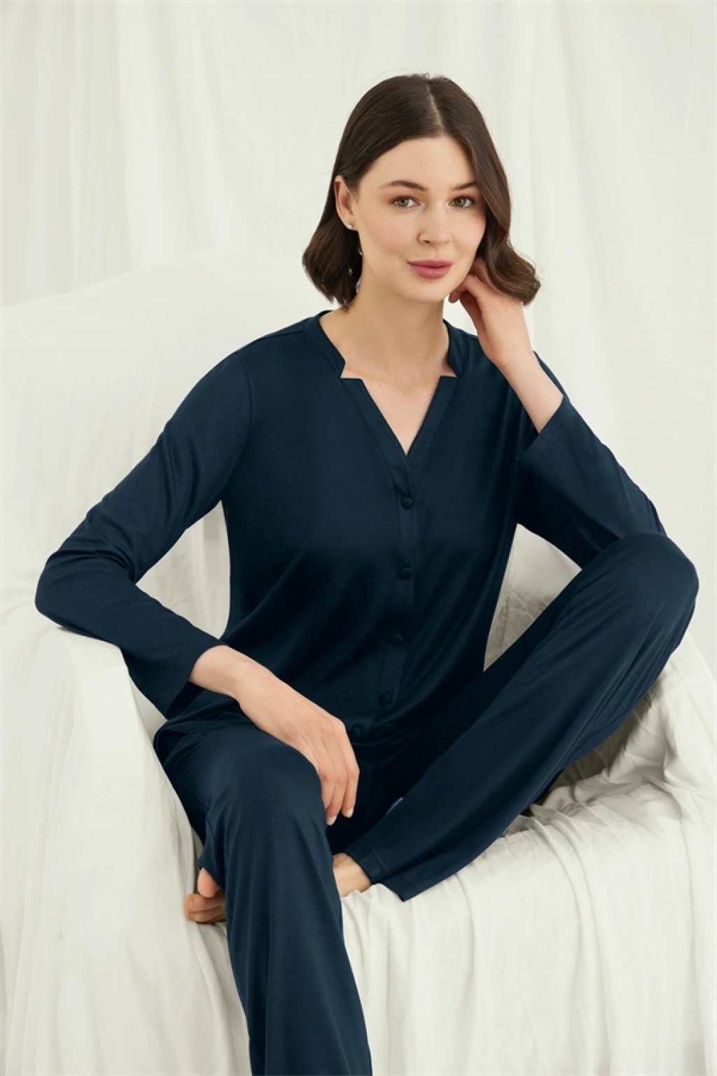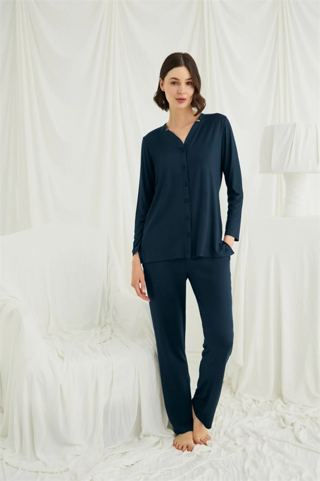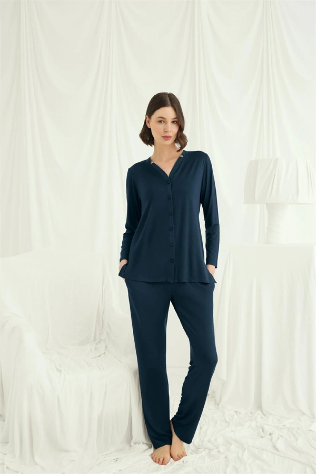 Üst: Gece mavisi renklidir, V yakalıdır, önü boydan düğmelidir, uzun kolludur, örme kumaştır.