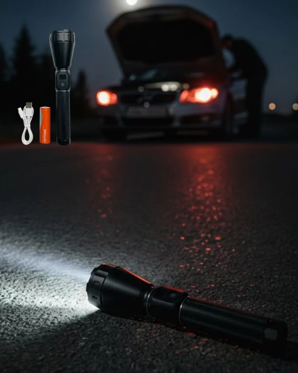 Bu güçlü LED el feneri, karanlık ortamlarda net ve güçlü aydınlatma sağlar. Yüksek lümen kapasitesi sayesinde geniş alanları etkili biçimde aydınlatır. Uzun mesafeli ışık huzmesi ile açık alan kullanımı için uygundur.9000mAh batarya kapasitesi, uzun süreli kullanım avantajı sunar. USB şarj desteği ile kolay ve pratik şekilde enerji doldurulabilir. Tekrar şarj edilebilir yapısı sayesinde ekonomik kullanım sağlar.Dayanıklı gövde tasarımı, darbelere karşı dirençlidir. Kaymaz yüzeyi sayesinde güvenli tutuş sağlar. Ürünle birlikte gelen taşıma çantası hem koruma hem de düzen avantajı sunar.Kamp, avcılık, elektrik kesintileri ve araç içi kullanım için uygundur. Güçlü performansı sayesinde zorlu koşullarda bile etkili sonuç verir.