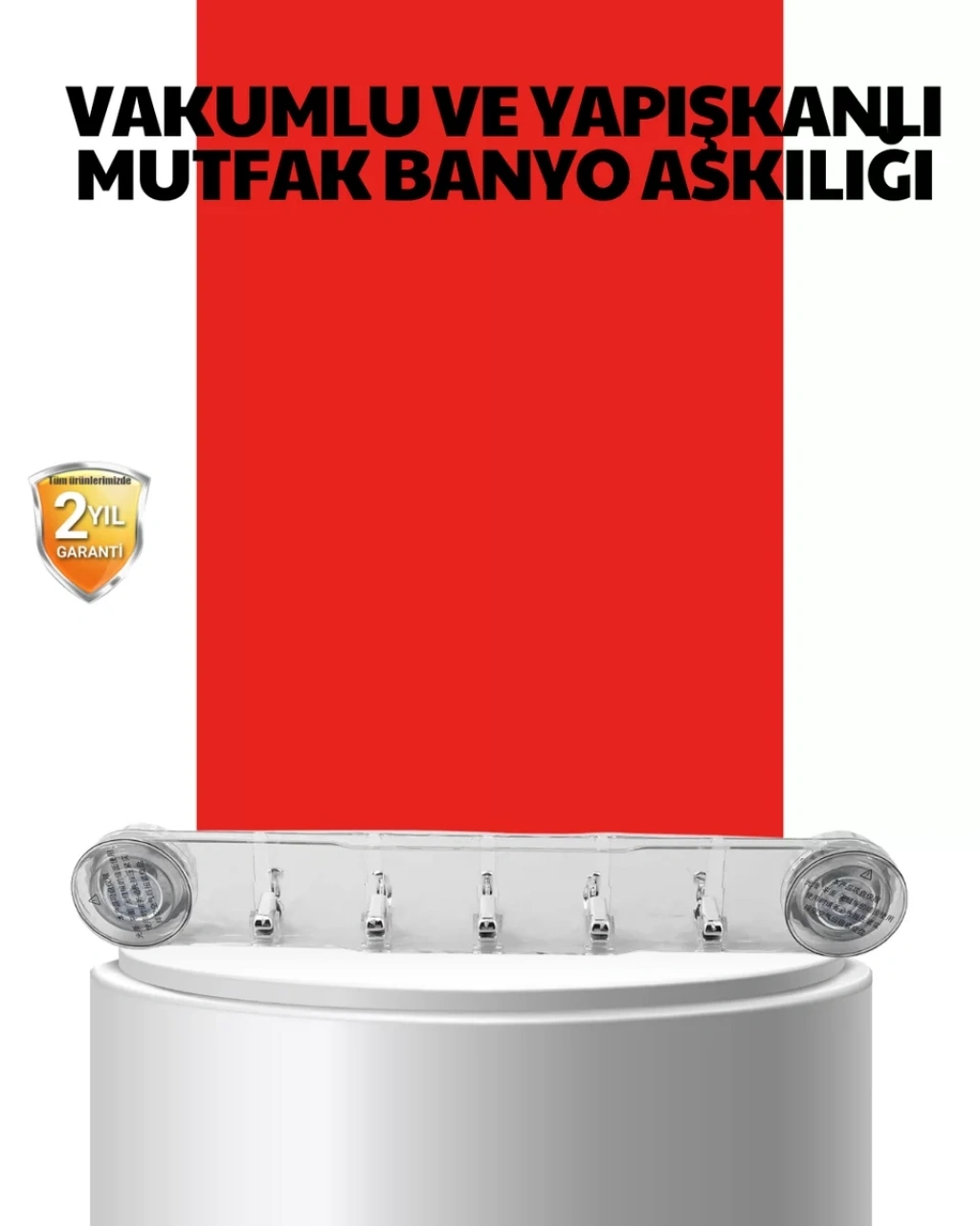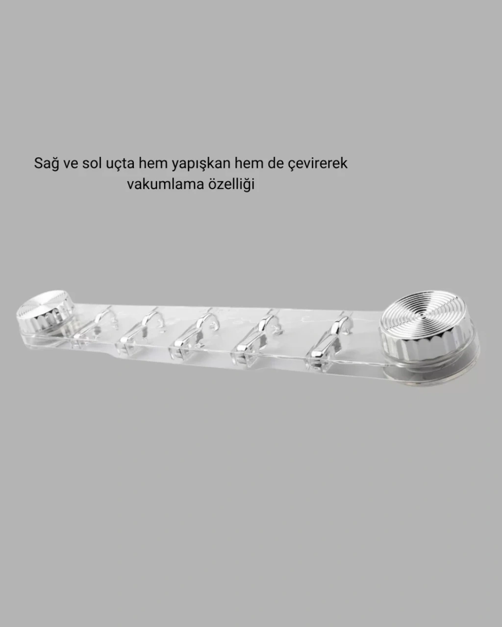 Vakumlu ve yapışkanlı mutfak banyo askılığı, yaşam alanlarında düzeni pratik şekilde sağlamak isteyen kullanıcılar için tasarlanmıştır. Beş adet askı bölmesi sayesinde mutfak ve banyoda sık kullanılan eşyaları kolayca asmanıza yardımcı olur. Havlu, sünger, lif, fırça, mutfak gereçleri ve benzeri aksesuarlar için ideal bir düzenleme çözümü sunar.Sağ ve sol uçlarda bulunan çevirerek vakumlama ve yapışkanlı sabitleme sistemi, ürünü farklı yüzeylere güvenle monte etmenizi sağlar. Fayans, cam ve parlak yüzeylerde güçlü tutunma sunar. Alet gerektirmeyen montaj yapısı sayesinde duvar delmeye gerek kalmadan hızlı ve zahmetsiz kurulum imkânı sunar.Orta bölümde yer alan şeffaf tasarım, modern ve sade bir görünüm kazandırırken kullanım alanına ferahlık katar. Suya ve buhara dayanıklı yapısı sayesinde banyo gibi nemli ortamlarda uzun süreli kullanım için uygundur. Paslanma veya deformasyon riskini azaltarak dayanıklı bir kullanım sunar.Askılığın çok yönlü tasarımı, yalnızca banyo değil mutfak, lavabo arkası veya çamaşır alanlarında da kullanım imkânı sağlar. Eşyaların kolay ulaşılabilir olmasına yardımcı olarak günlük kullanım konforunu artırır.Vakumlu ve yapışkanlı askılık, düzenli bir alan oluşturmak isteyenler için pratik, estetik ve fonksiyonel bir çözümdür. Hem montaj kolaylığı hem de dayanıklı yapısıyla ev düzenine katkı sağlar.