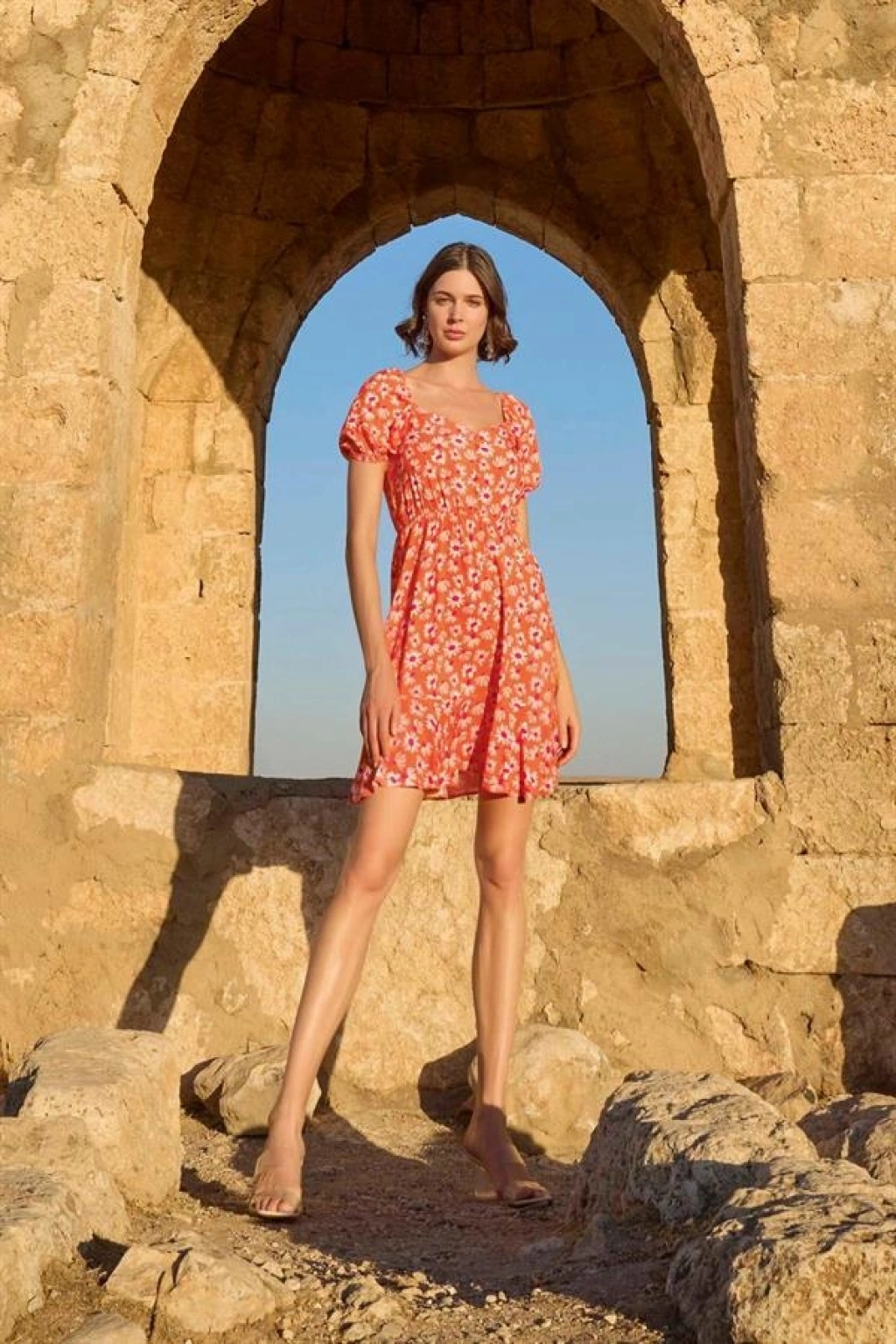 Elbise: Turuncu zemin üzerine çiçek desenlidir, derin V yakalıdır, kısa kolludur, kol ağzı lastiklidir, dokuma kumaştır.