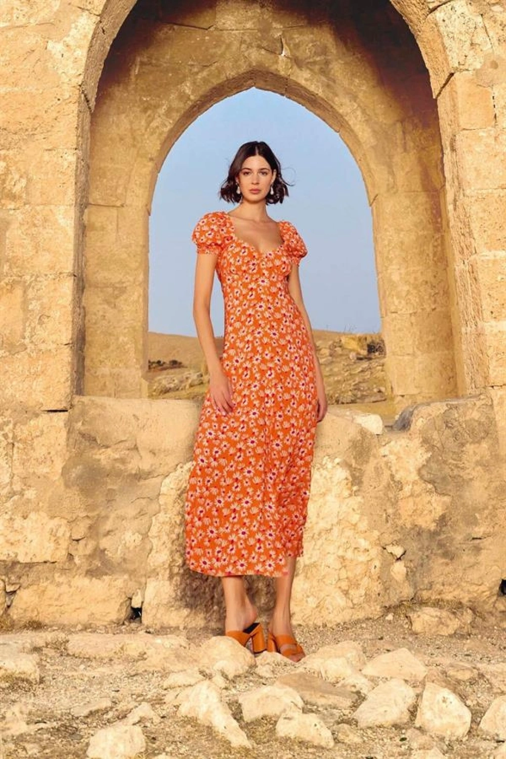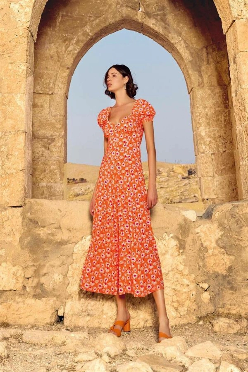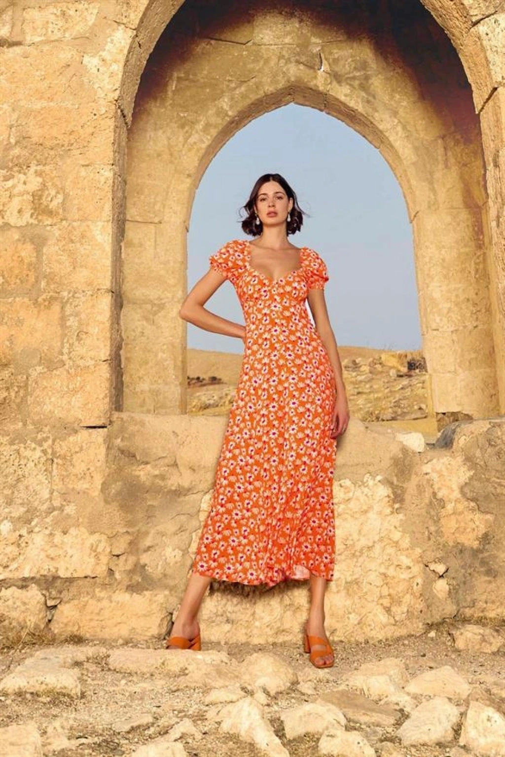 Elbise: Turuncu zemin üzerine çiçek desenlidir, derin V yaka dekoltelidir, kısa kolludur, kol ağzı lastiklidir, dokuma kumaştır.