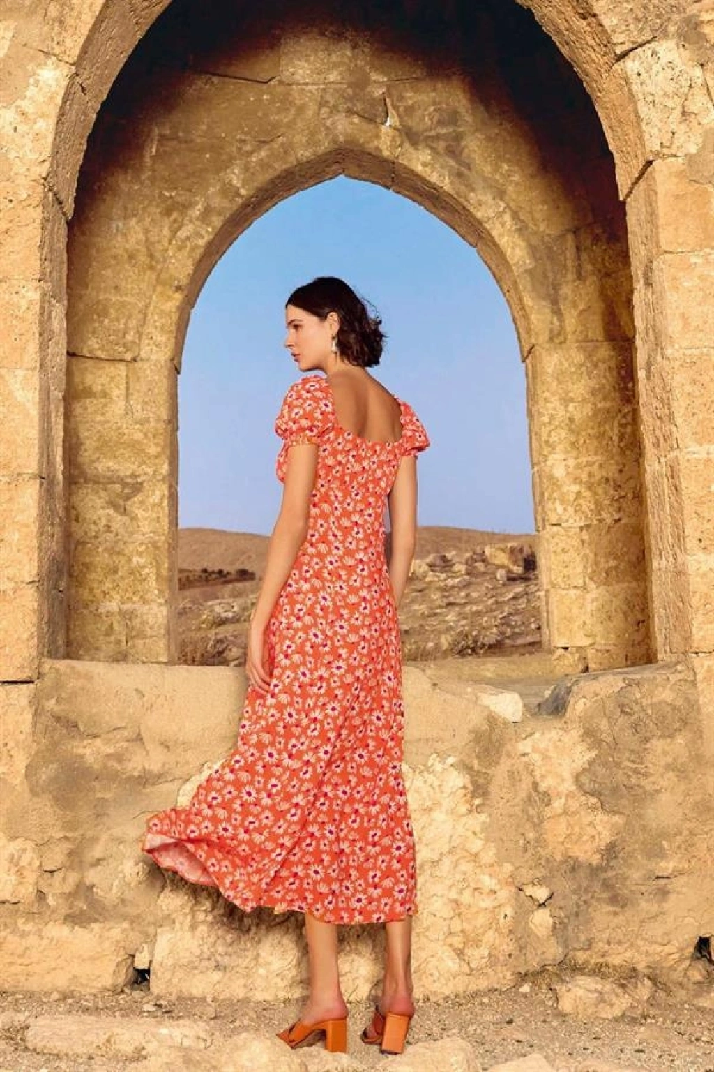 Elbise: Turuncu zemin üzerine çiçek desenlidir, derin V yaka dekoltelidir, kısa kolludur, kol ağzı lastiklidir, dokuma kumaştır.