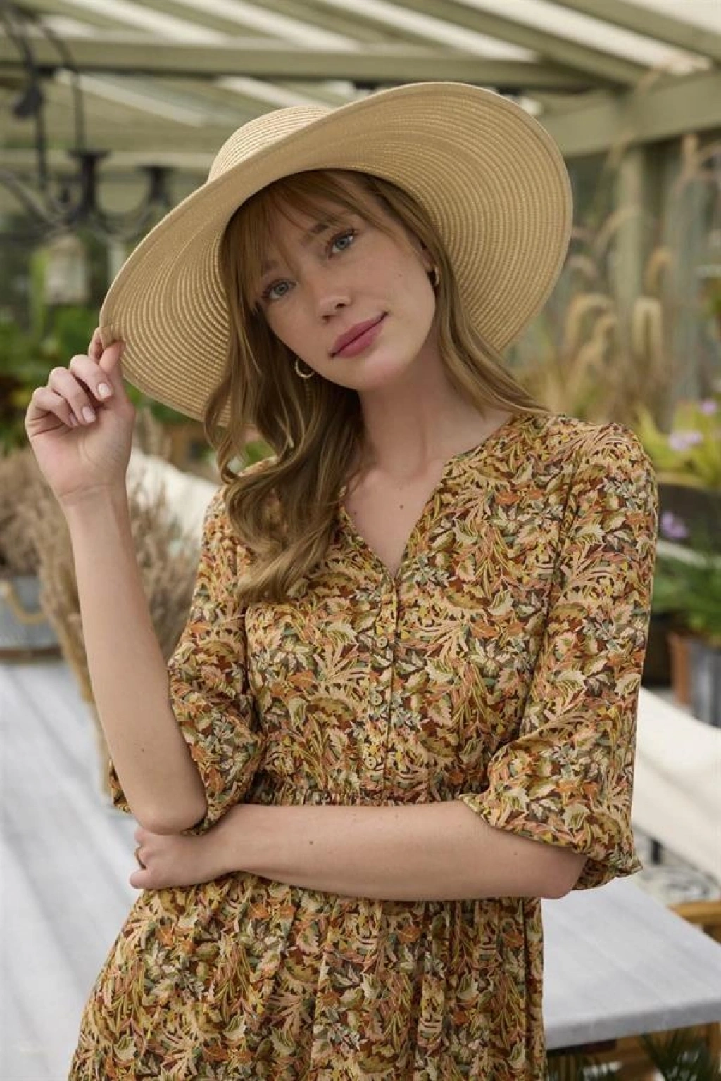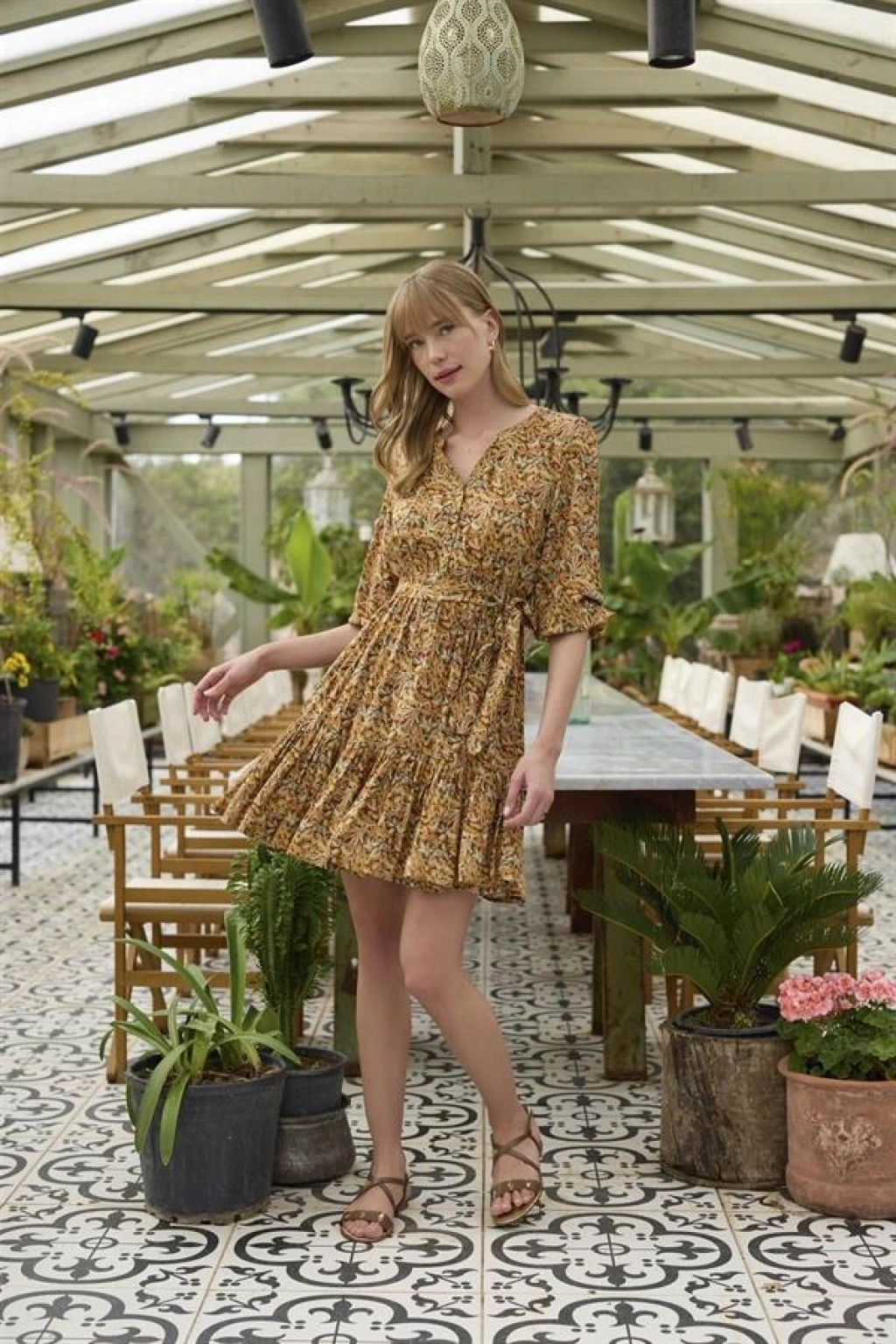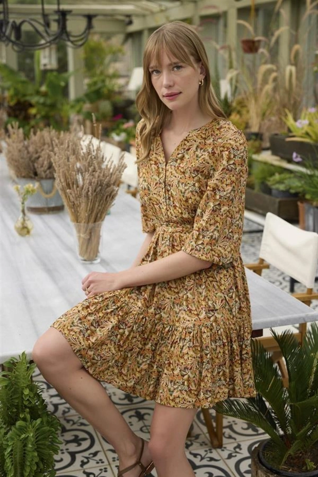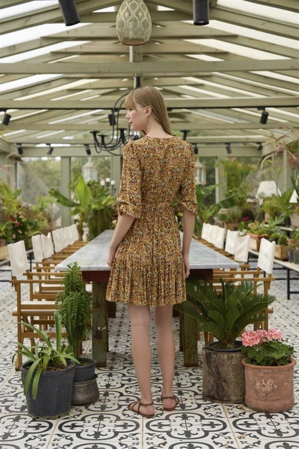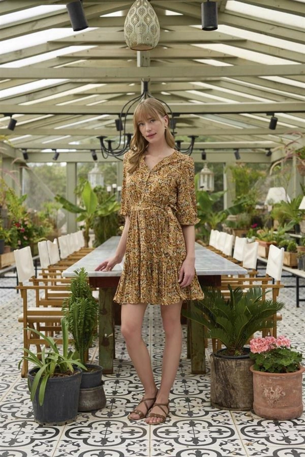 Elbise: Çiçek ve yaprak desenlidir, V yakalıdır, truvakar kolludur, önü düğmelidir, önden bağlamalıdır, dokuma kumaştır.