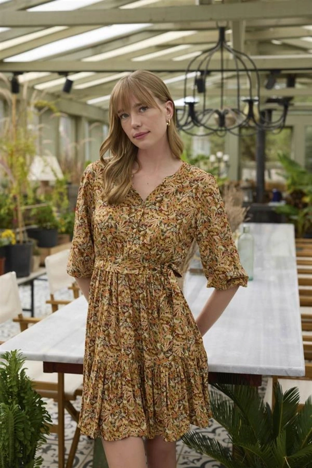 Elbise: Çiçek ve yaprak desenlidir, V yakalıdır, truvakar kolludur, önü düğmelidir, önden bağlamalıdır, dokuma kumaştır.