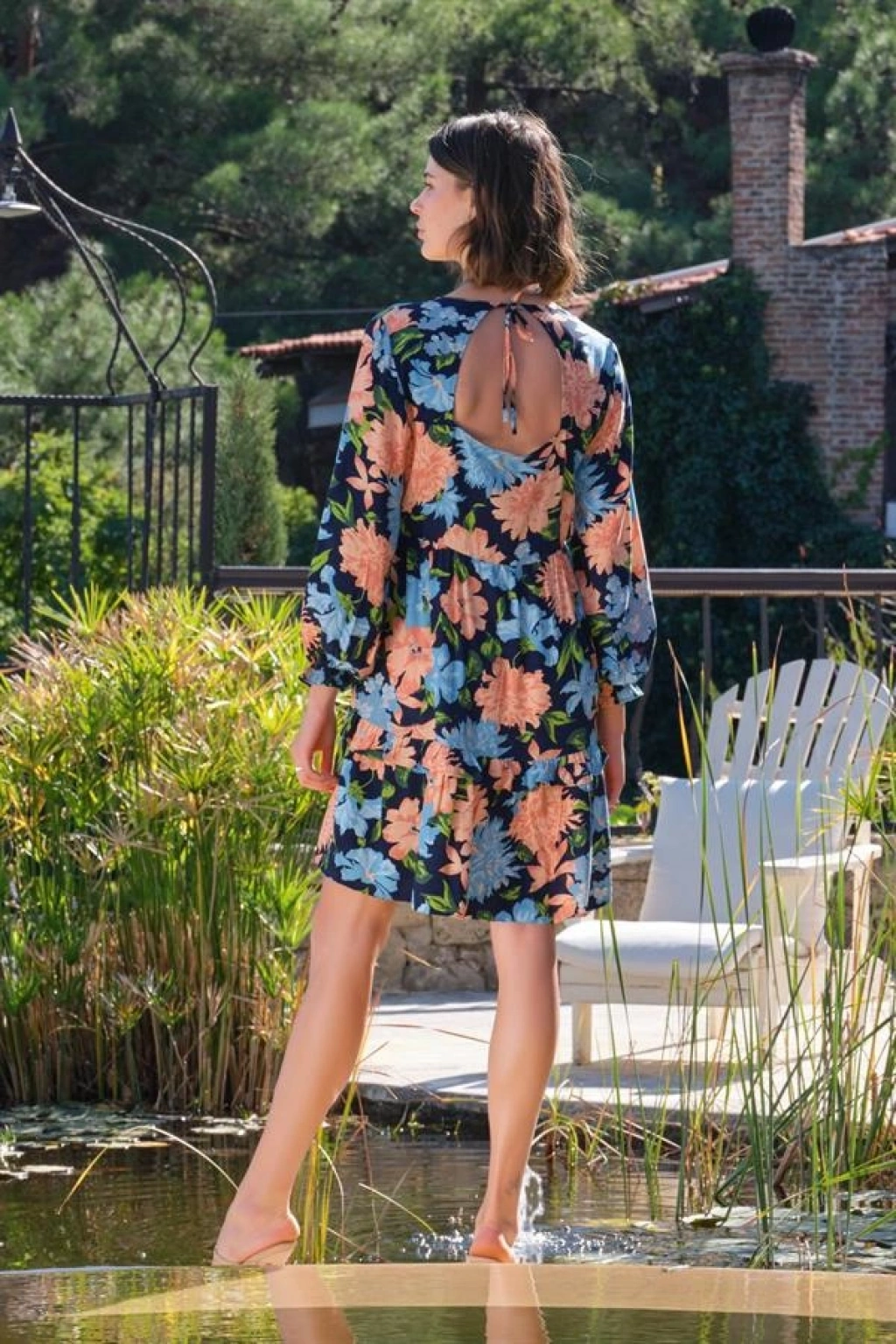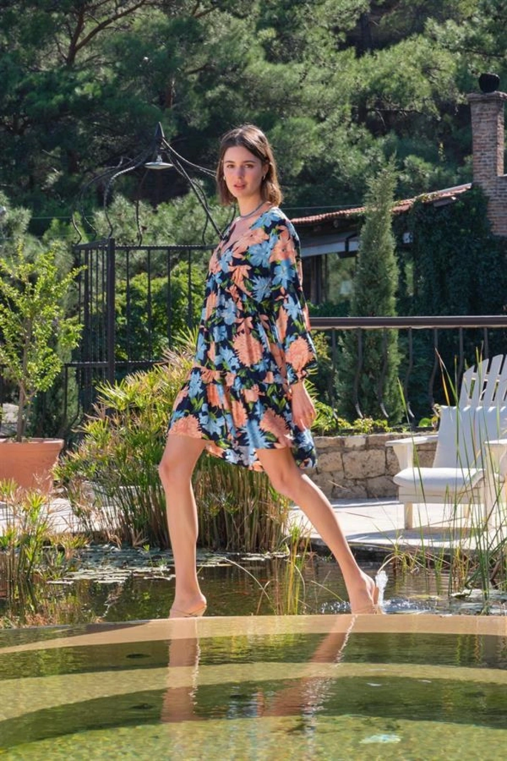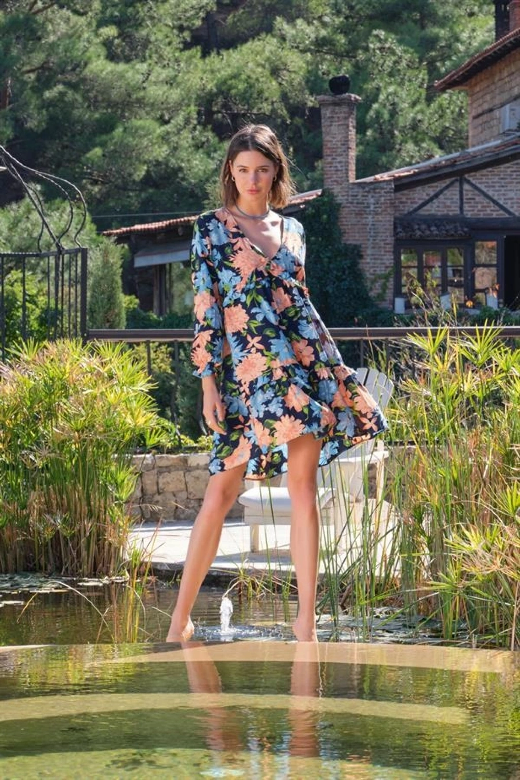 Elbise: Lacivert zemin üzerine çiçek ve yaprak desenlidir, uzun kolludur, bileği lastiklidir, derin V yakalıdır, sırt dekoltelidir, dökümlüdür, enseden bağlamalıdır, dokuma kumaştır.