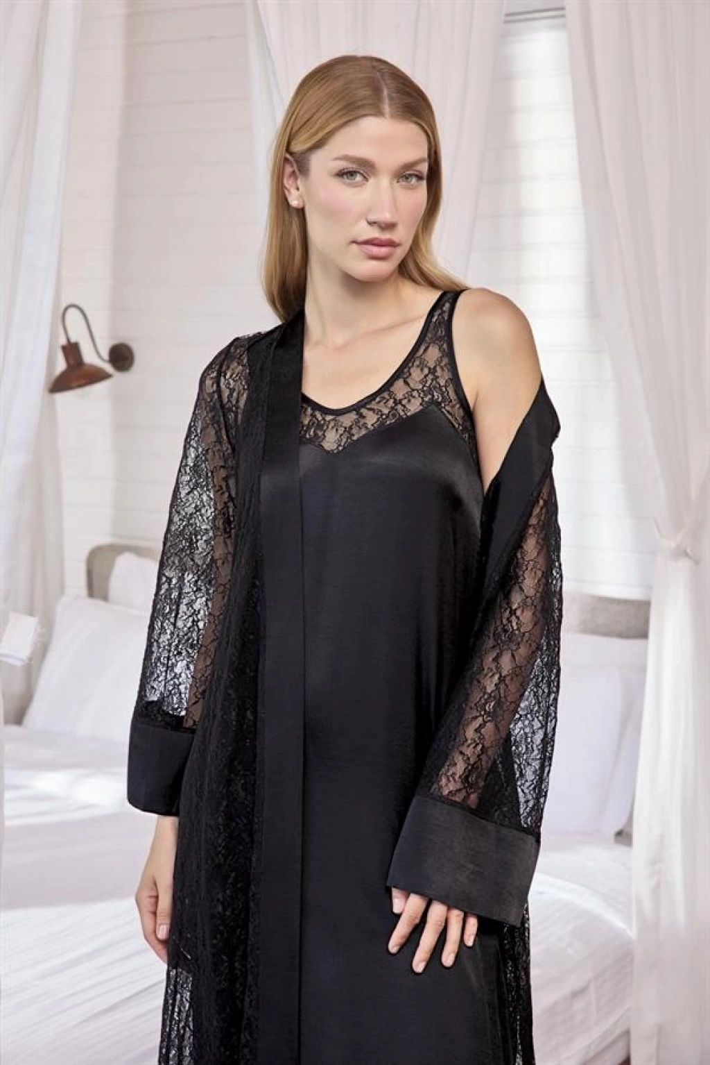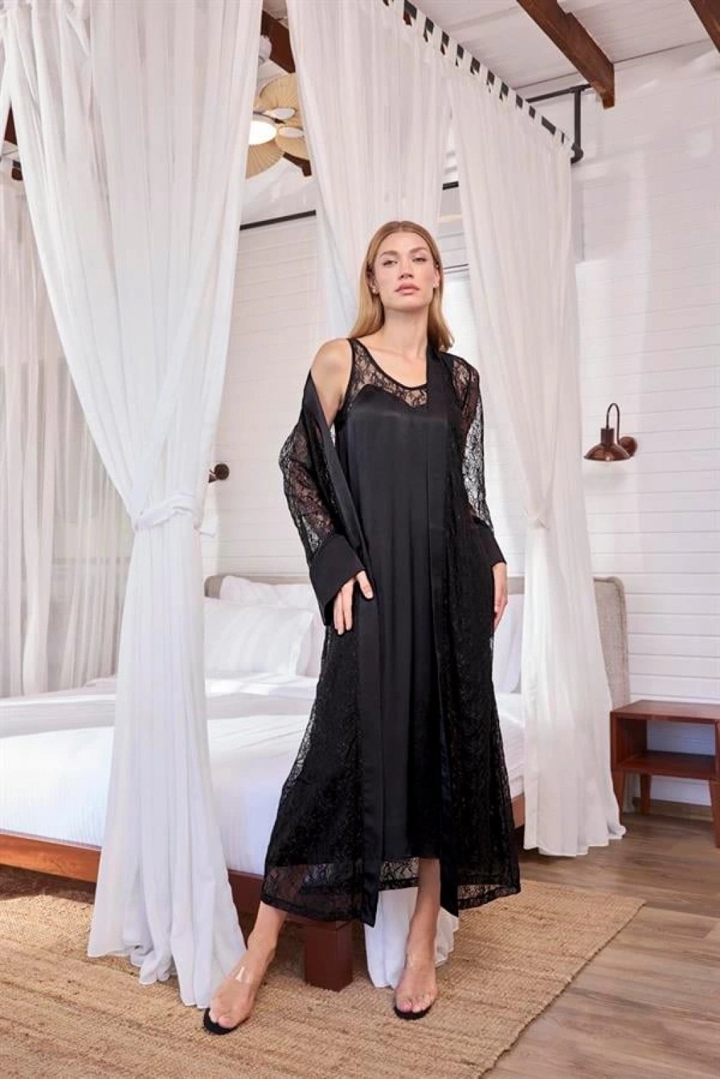 Gecelik: Siyah renklidir, derin V yakalıdır, sırt ve göğüs dekoltelidir, yakası dantellidir, kalın askılıdır, dokuma kumaştır.