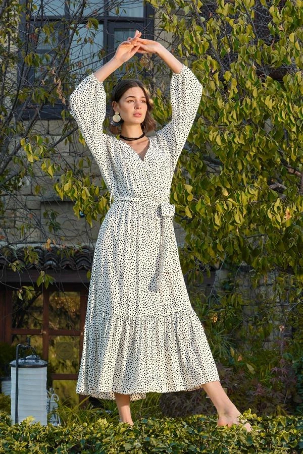 Doğal ve nefes alabilen %100 viskon kumaşı ile gün boyu konfor sunan bu elbise, zamansız puantiye deseniyle feminen ve zarif bir stil yaratır. Belden kuşak detayı, vücut hatlarını dengeli şekilde vurgulayarak şık bir siluet oluşturur.