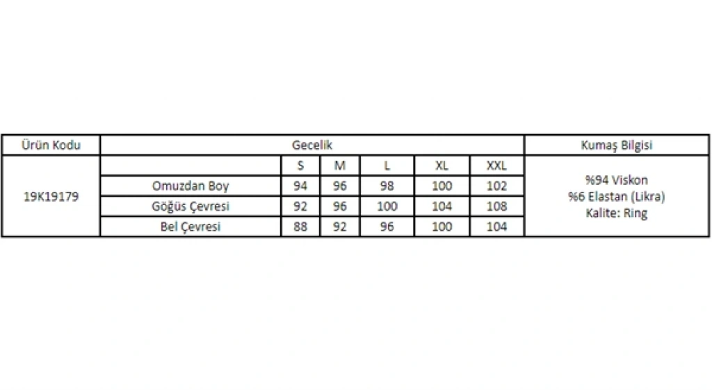Gecelik: Vizon renklidir, bisiklet yakalıdır, yakası damla detaylıdır, kısa kolludur, yırtmaçlıdır kolu ve yırtmacı brode dantellidir, örme kumaştır.
