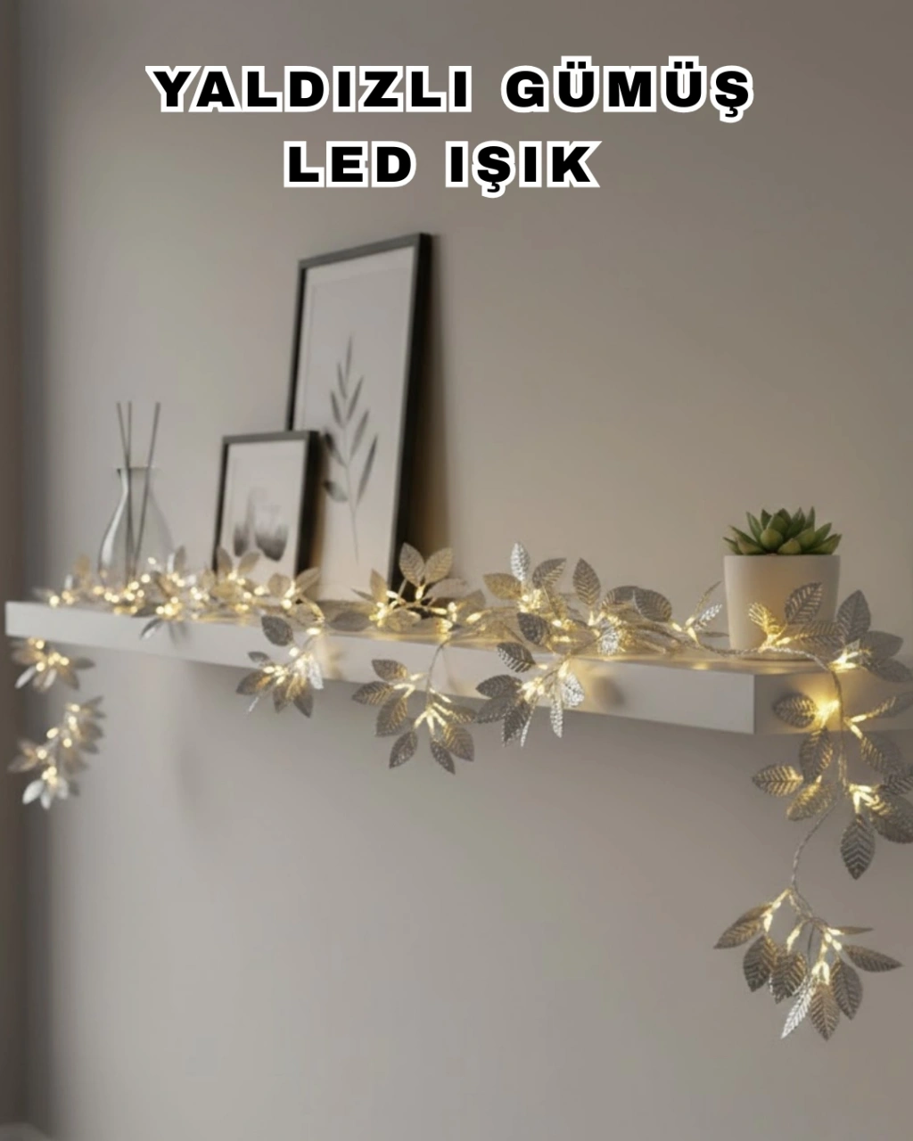 Yaldızlı gümüş yaprak LED ışık, yaşam alanlarına zarif ve sıcak bir atmosfer kazandırmak isteyenler için tasarlanmıştır. Yaprak formundaki dekoratif detayları sayesinde klasik LED aydınlatmalardan ayrılır ve bulunduğu ortama şık bir görünüm katar. Gümüş tonları, ışıkla birleştiğinde göz yormayan ama dikkat çeken bir ambiyans oluşturur.Pilli çalışma özelliği sayesinde priz veya kablo karmaşasına ihtiyaç duymadan kullanılabilir. Bu sayede salon, yatak odası, vitrin, raf, masa, duvar ve pencere kenarlarında rahatlıkla konumlandırılabilir. Taşınabilir yapısı sayesinde istenilen her alanda dekoratif bir tamamlayıcı olarak kullanılabilir.Ev dekorasyonunda sıcak ve huzurlu bir atmosfer yaratmak isteyenler için ideal olan bu LED ışık, yılbaşı ve özel gün süslemelerinde de sıklıkla tercih edilir. Minimal ama şık tasarımı sayesinde kalabalık bir görüntü oluşturmaz, ortamın genel dekoruna kolayca uyum sağlar.Uzun LED dizilimi, ışığın dengeli şekilde yayılmasını sağlar. Yaprak detaylarının metalik görünümü, ışık açıkken olduğu kadar kapalıyken de dekoratif bir aksesuar olarak kullanılmasına olanak tanır. Hem modern hem klasik dekorasyon stilleriyle uyumludur.Dekoratif gümüş yaprak LED ışık; ev, ofis, vitrin ve organizasyon süslemeleri için estetik ve kullanışlı bir aydınlatma çözümüdür.