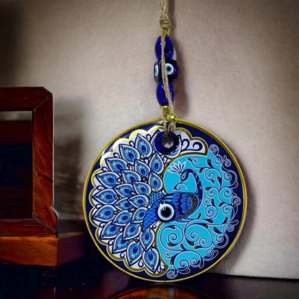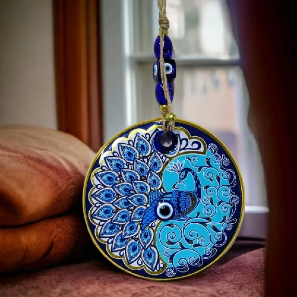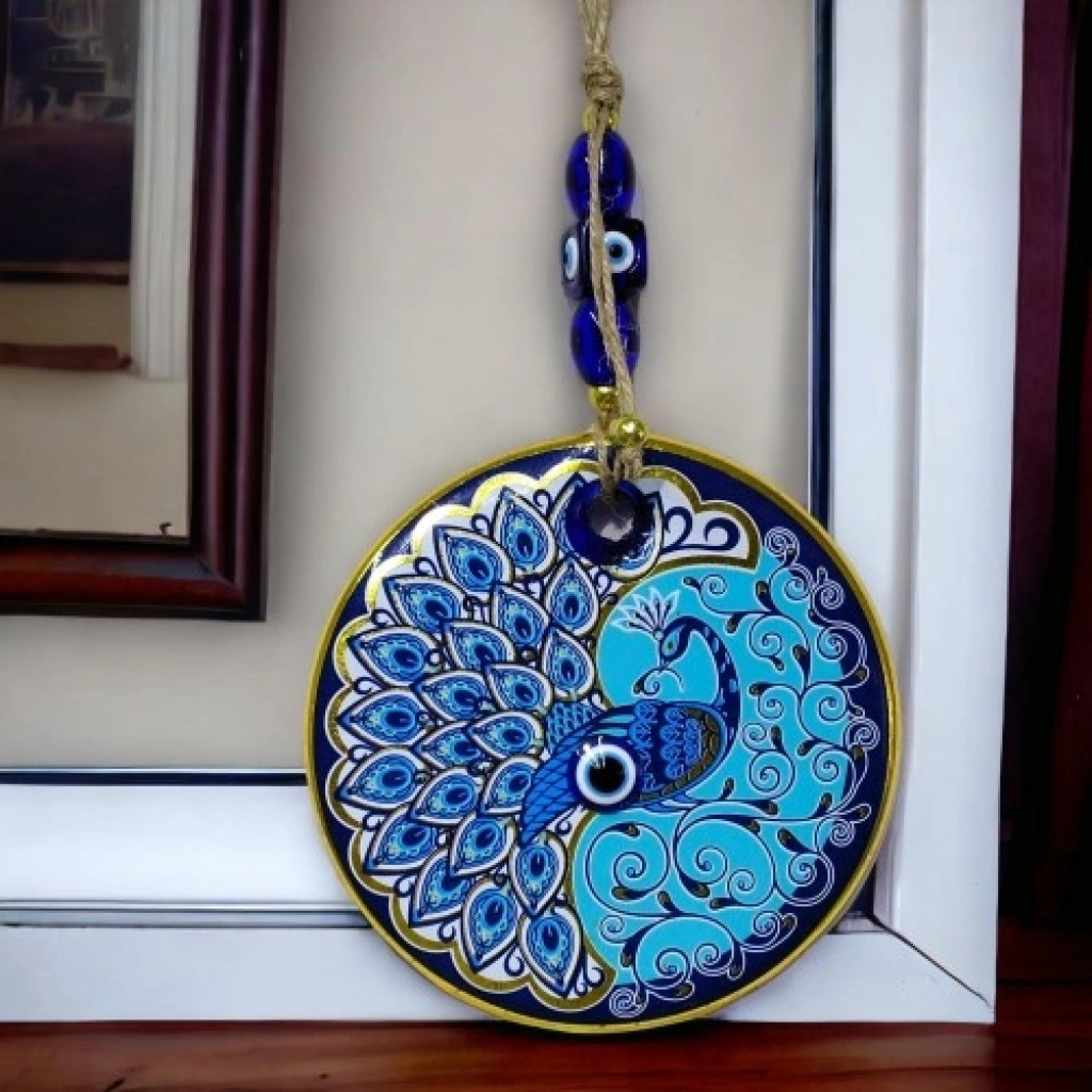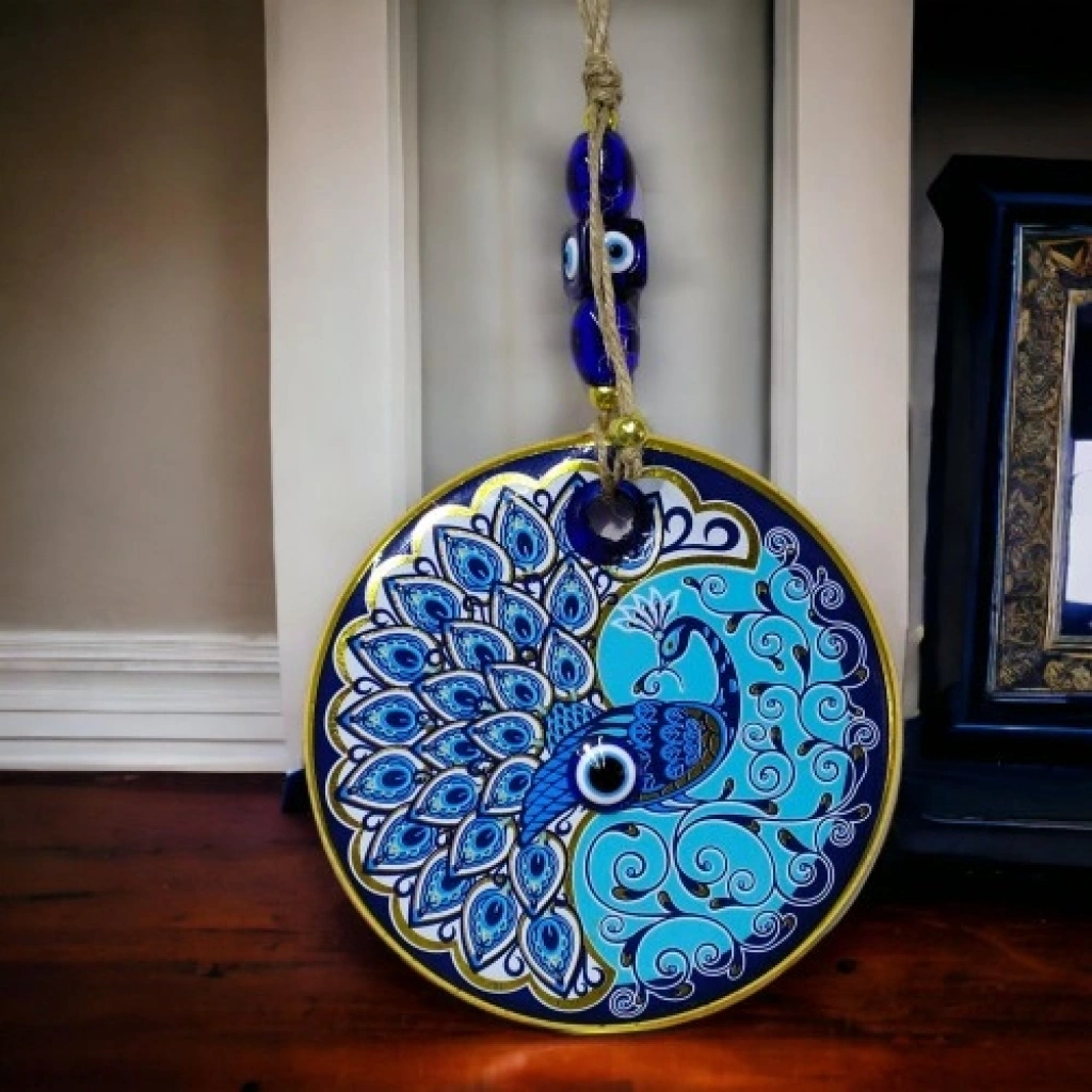 Tavus kuşu duvar süsümüz nazar boncuğu ile süslenmiştir. Ürünümüz mavi cam nazar boncuğundan tamamen el işçiliği ile üretilmiştir. Ürünümüzün yuvarlak kısmı 13 santimetre çapındadır. Duvar süsümüz ip dahil yaklaşık 30 santimetre boyundadır.
