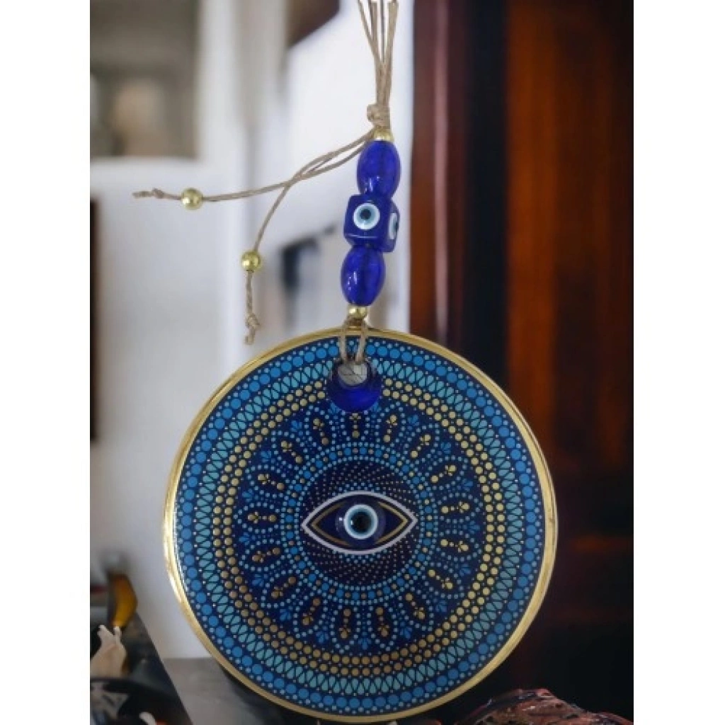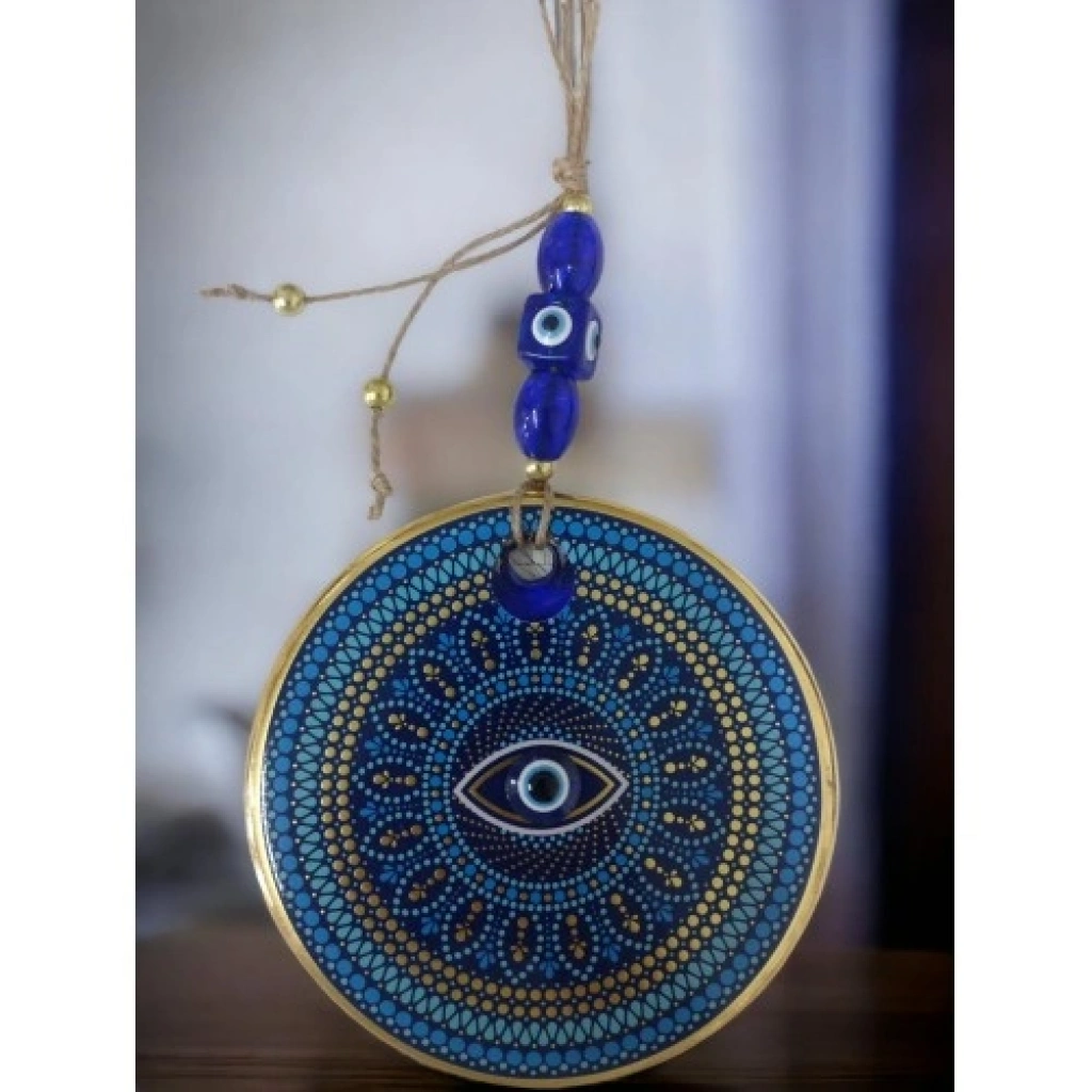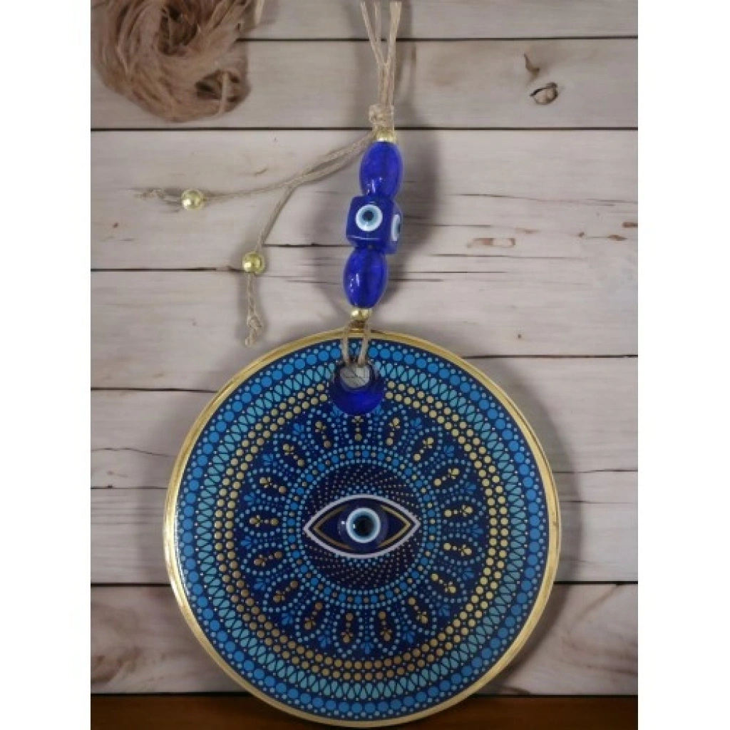 Yaldızlı puantiyeli göz tasarımına sahiptir.Mavi cam nazar boncuğundan el yapımı olarak üretilmiştir.Duvar süsü ve nazarlık olarak kullanıma uygundur.Ürün ÖlçüleriYuvarlak cam kısmı 13 santimetre çapındadır.İp dahil toplam uzunluğu yaklaşık 30 santimetredi