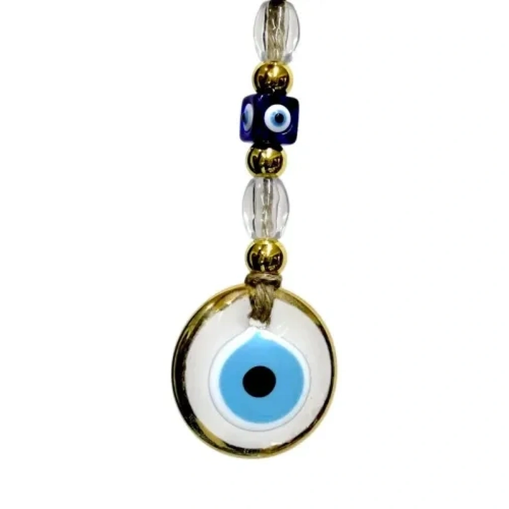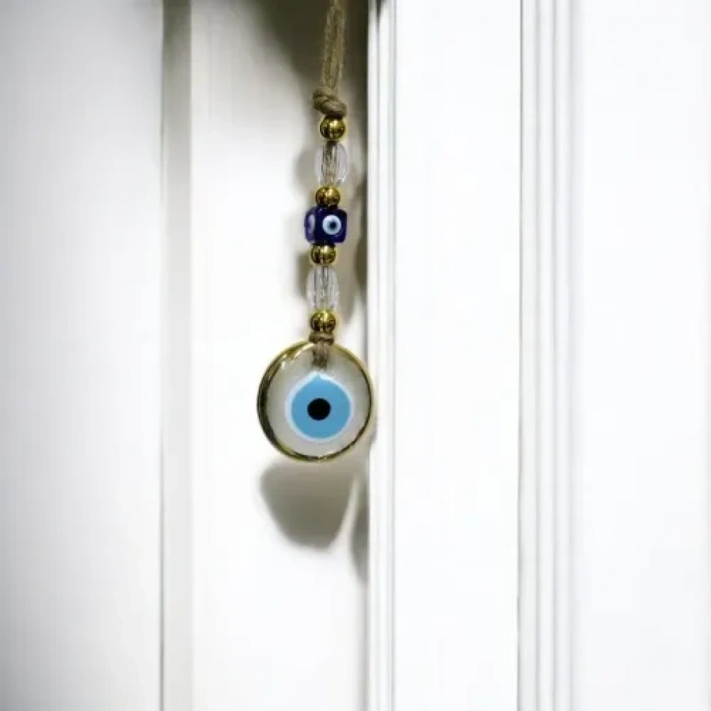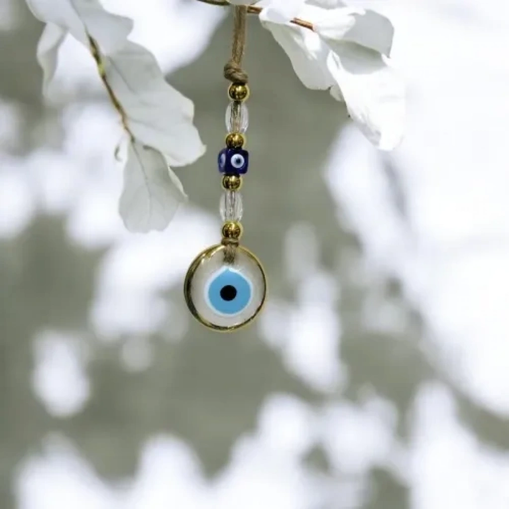 Yaldızlı Şeffaf Nazar Boncuklu Cam Duvar SüsüYaldızlı, camın zarif şeffaflığı ve altın yaldız detayların şık uyumuyla tasarlanan bu nazar boncuklu cam duvar süsü, ev ve ofis dekorasyonuna estetik ve manevi bir değer katar. Nazar boncuğu figürü, kötü enerjilere karşı koruyucu bir sembol olarak bilinirken, minimalist tasarımıyla her dekorasyon stiline kolayca uyum sağlar.Şeffaf cam yapısı sayesinde ışığı nazikçe kırarak bulunduğu ortama ışıltılı ve ferah bir atmosfer kazandırır. Altın yaldız detaylar, ürüne zarafet katarken sade tasarımıyla göz yormayan şık bir dekoratif tamamlayıcı sunar.Duvar süsümüzün yuvarlak cam kısmı 5 santimetre çapındadır. İp dahil yaklaşık 26 santimetre toplam uzunluğa sahiptir. Hafif yapısı sayesinde duvara, kapı girişine veya pencere önüne kolaylıkla asılabilir. Salon, antre, ofis ve çalışma alanları için ideal olan bu yaldızlı şeffaf cam duvar süsü; hem dekoratif hem de anlamlı yapısıyla yaşam alanlarınızın enerjisini değiştirecek zarif bir aksesuardır. Aynı zamanda şık ve anlamlı bir hediyelik olarak da tercih edilebilir.