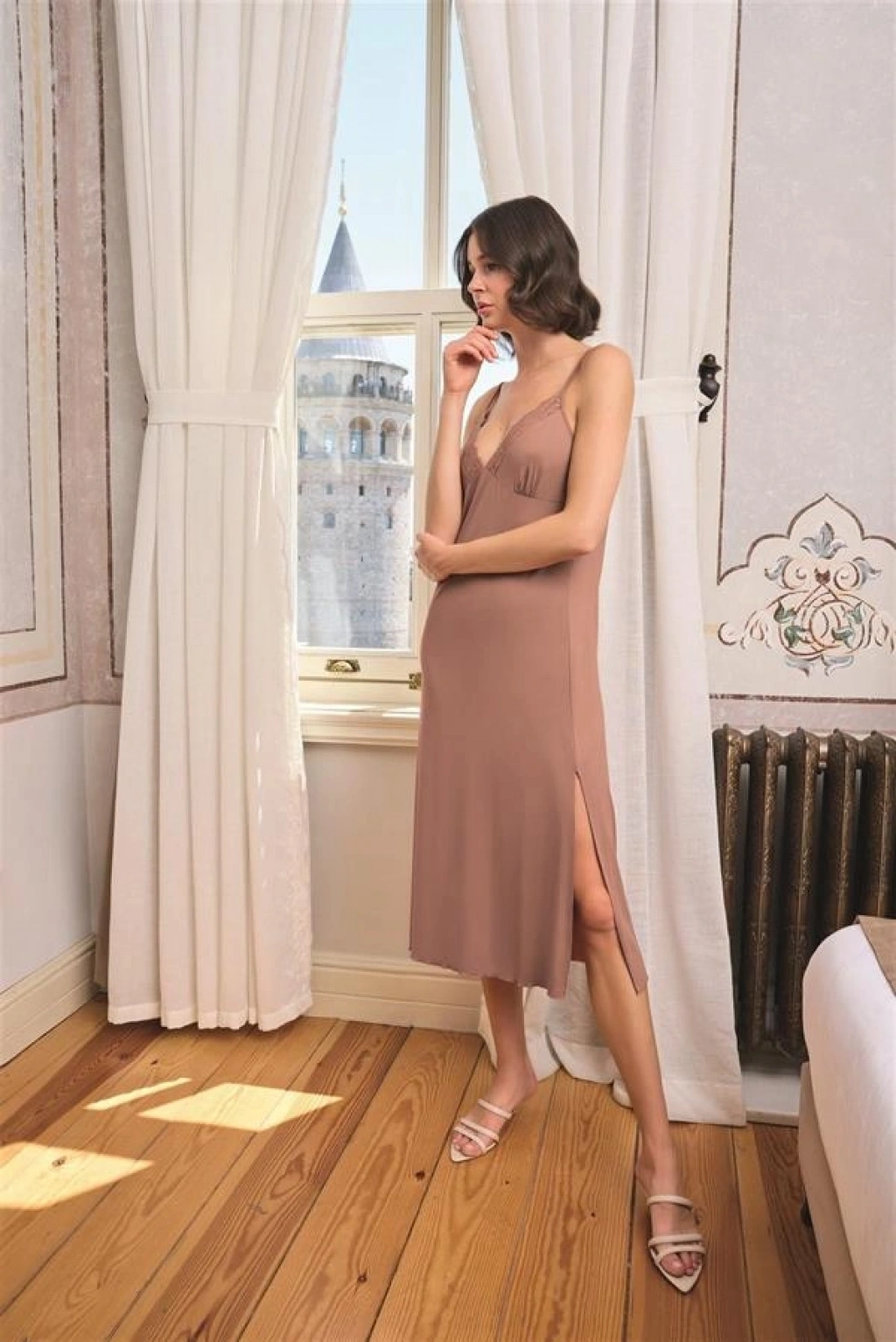 Gecelik: Somon renklidir, derin V yaka dekoltelidir, ayarlanabilir ip askılıdır, yırtmaçlıdır, yakası dantellidir, büyük bedendir, örme kumaştır.