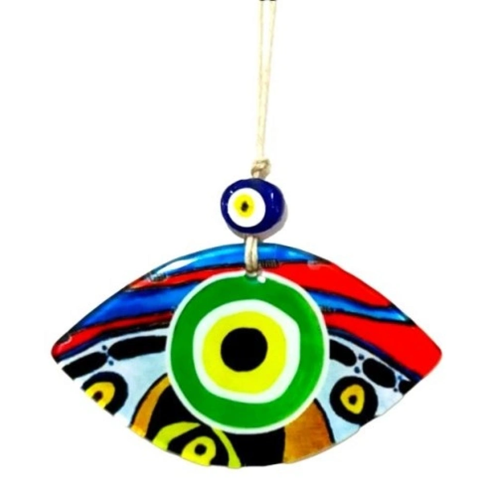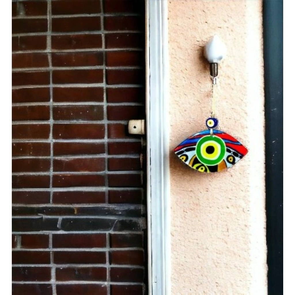 Yeşil göz modelli duvar süsümüz 15 cm eninde, 8 cm boyundadır. Füzyon cam malzeme kullanılarak üretilen duvar süsümüz ip dahil 23 cm boyundadır.
