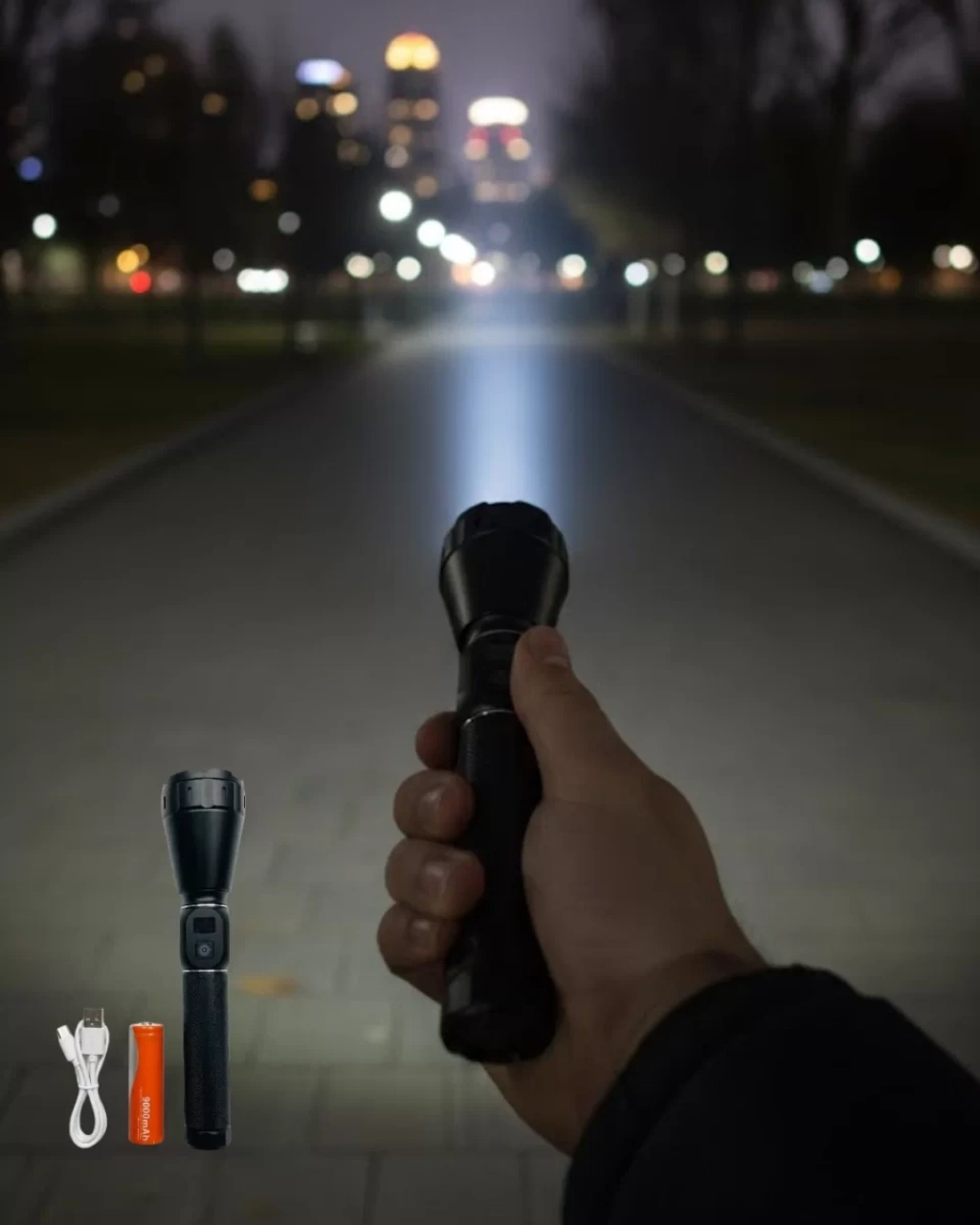 Bu yüksek performanslı şarjlı el feneri, güçlü aydınlatma ihtiyacı olan kullanıcılar için tasarlanmış profesyonel bir çözümdür. 60W güç kapasitesi ve 6000 lümen seviyesine kadar ulaşabilen yoğun ışık çıkışı sayesinde karanlık ortamlarda maksimum görüş sağlar. Geniş alan aydınlatmasında, uzun mesafeli odak gerektiren durumlarda ve acil anlarda güvenilir bir ışık kaynağı sunar.Set içerisinde yüksek kapasiteli 9000mAh pil bulunmaktadır. Bu güçlü batarya sayesinde uzun süreli kullanım avantajı elde edilir. Elektrik kesintilerinde, kamp aktivitelerinde, gece yürüyüşlerinde ve araç içi acil durumlarda kesintisiz performans sağlar. şarj kablosu ile kolayca şarj edilebilir ve pratik kullanım sunar.Dayanıklı gövde yapısı, darbeye karşı dirençli tasarımı ve ergonomik tutuş sağlayan kaymaz yüzeyi sayesinde güvenli kullanım imkânı sunar. Elinize tam oturan yapısı uzun süreli kullanımlarda konfor sağlar. Ürünle birlikte gelen sert koruma taşıma çantası, hem düzenli saklama hem de seyahatlerde güvenli taşıma avantajı sağlar.Kamp, doğa yürüyüşü, avcılık, güvenlik, teknik servis çalışmaları ve ev içi acil durumlar için ideal bir tercihtir. Yüksek ışık performansı, uzun batarya süresi ve sağlam tasarımıyla profesyonel ve bireysel kullanıcılar için güçlü bir aydınlatma çözümüdür.